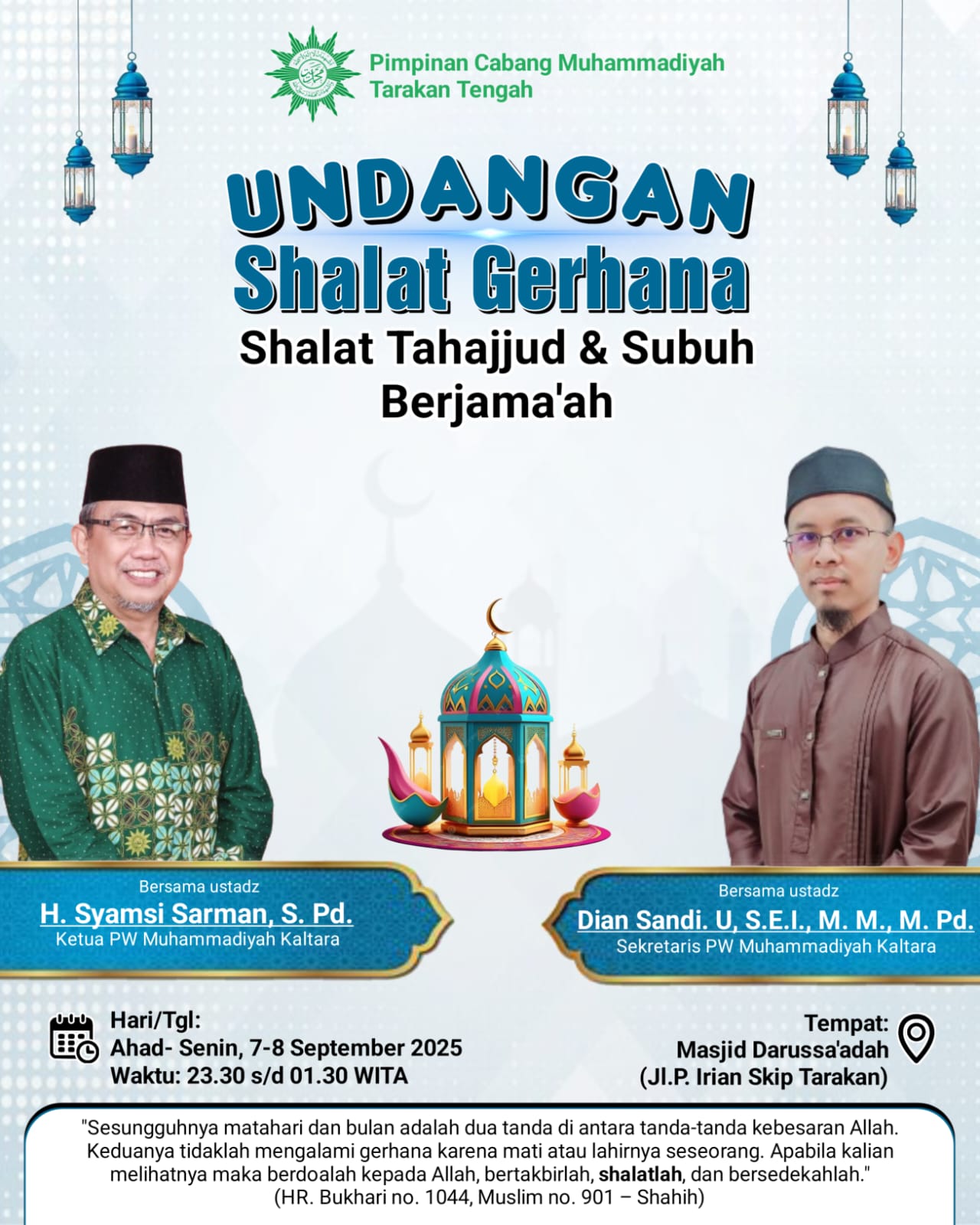 TARAKAN – Majelis Tarjih dan Tajdid Pimpinan Pusat (PP) Muhammadiyah mengeluarkan maklumat tentang pelaksanaan salat gerhana bulan total yang akan terjadi pada Ahad Pahing hingga Senin Pon, bertepatan dengan 15–16 Rabiulawal 1447 Hijriah atau 7–8 September 2025 Masehi.